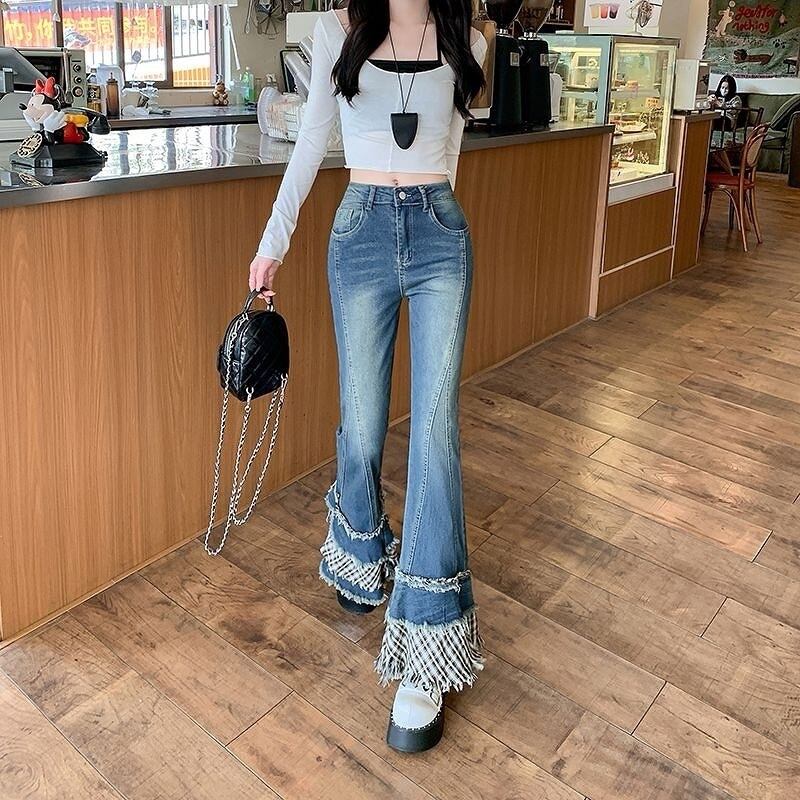 ❤︎この"チェック柄 バイカラー フレアデニムパンツ"は、あなたのスタイルを華やかに引き立てる特別なアイテムです!