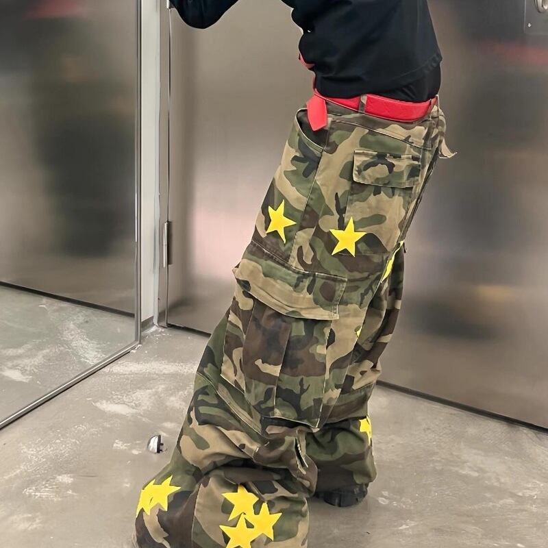 ❤︎この"星×迷彩ワイドシルエットカーゴパンツ"は、個性的なデザインが際立つトレンドアイテムです!
