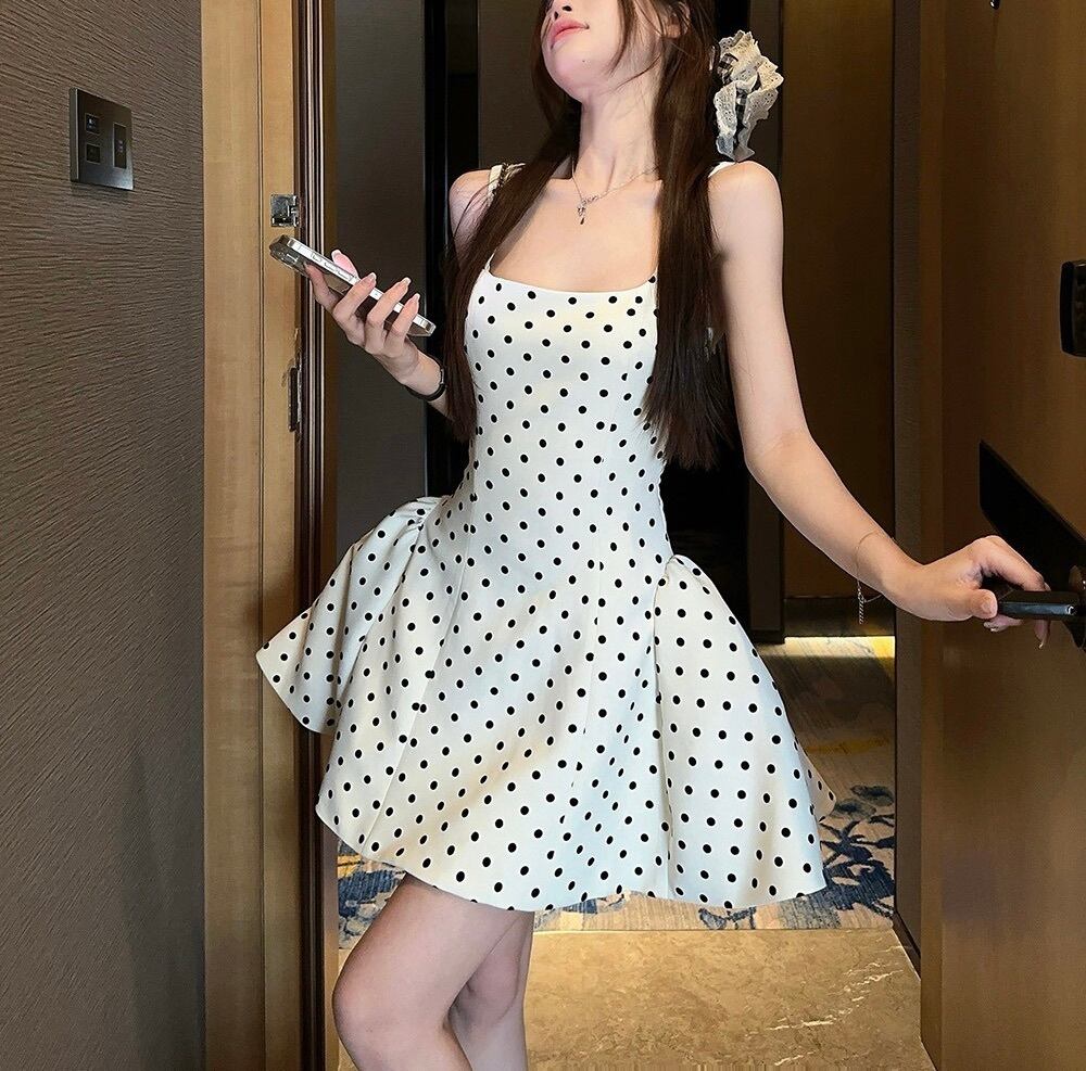 ❤︎この"ドット柄 ミニフレアミニワンピースドレス"は、キュートで華やかな印象を与える魅力的なアイテムです!