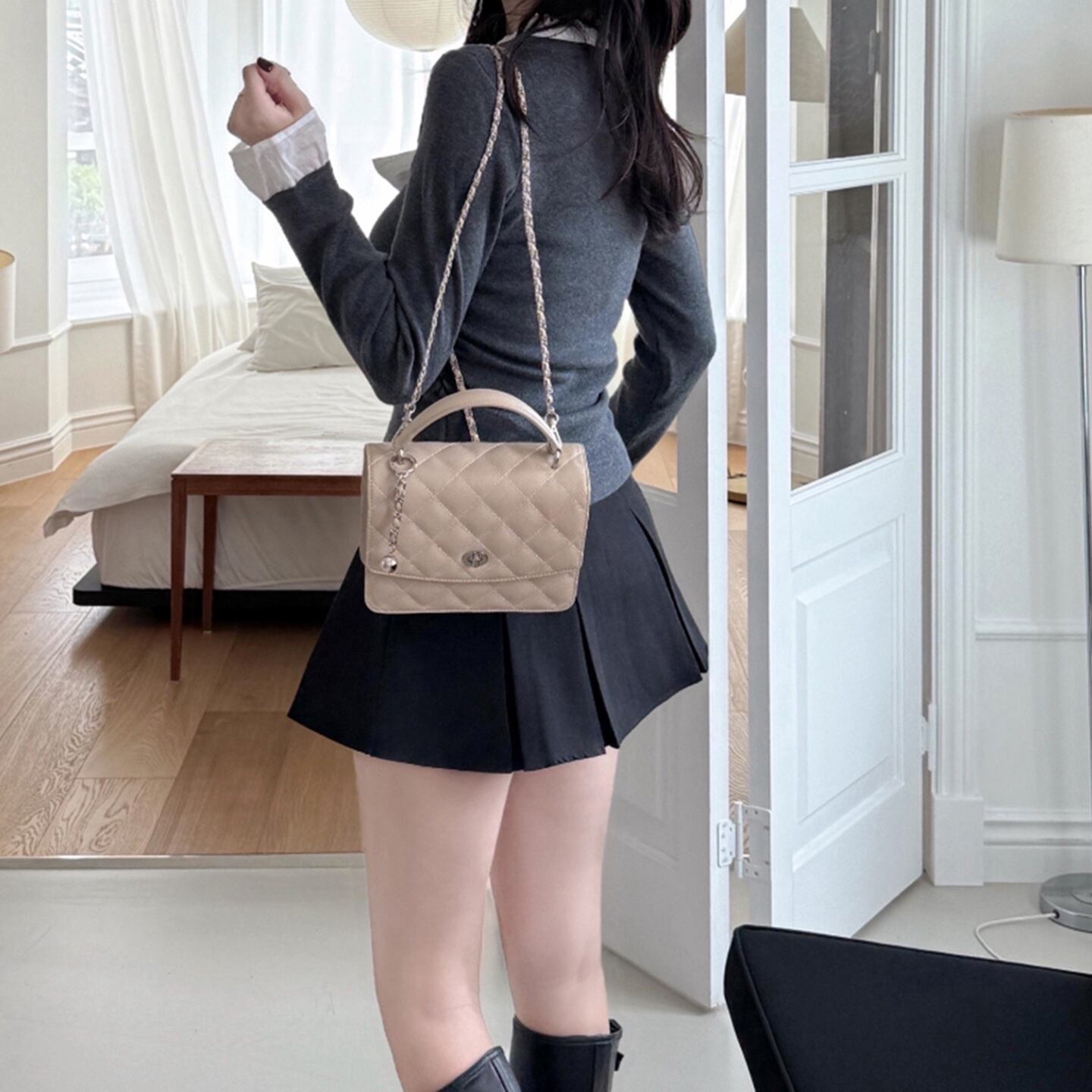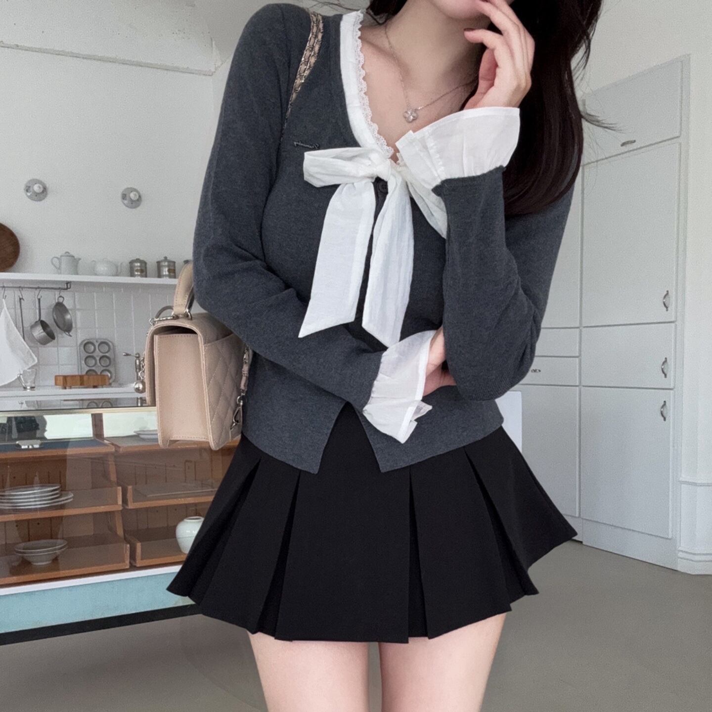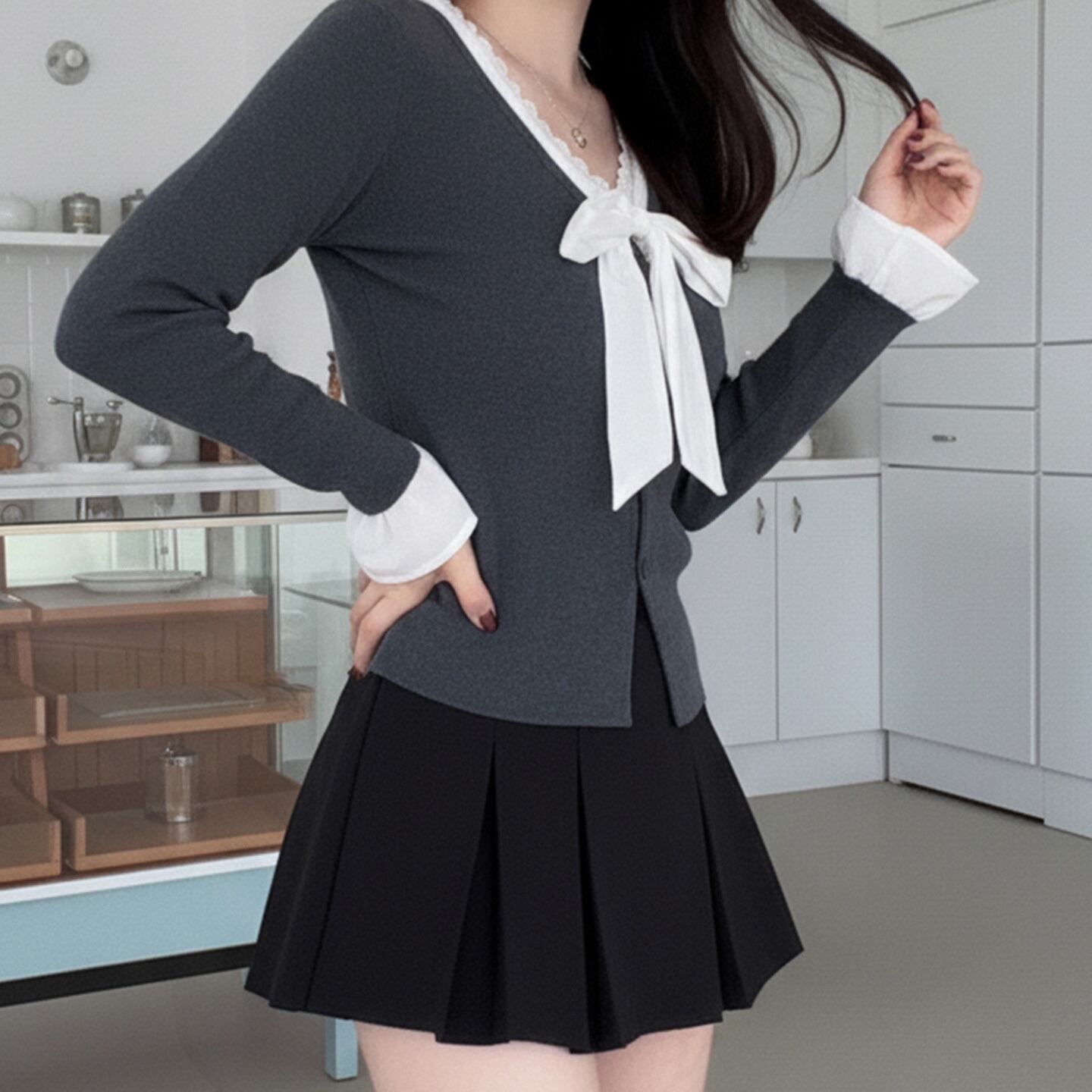 ❤︎Vネックデザインとリボンタイが特徴で、上品さを引き立て、さまざまなシーンに合わせやすい一着となっています。デートや特別なお出かけにぴったりです。