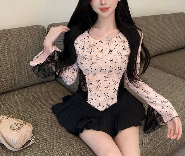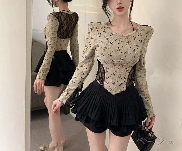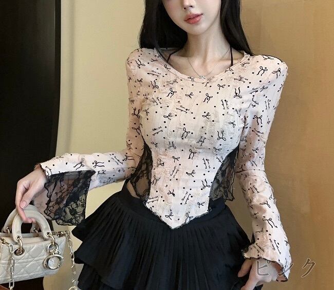 リボン柄レースバイカラートップス